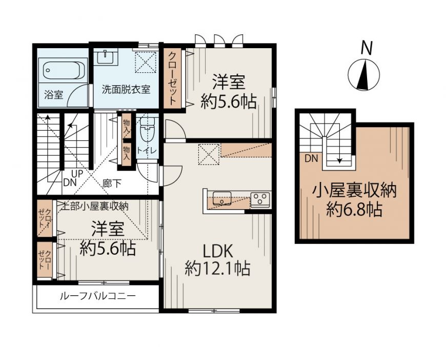 | 間取内訳/間取備考 | LDK12.1帖 / 洋5.6帖 / 洋5.6帖 / その他6.8帖/■その他→屋根裏収納 ■ルーフバルコニー:有 |